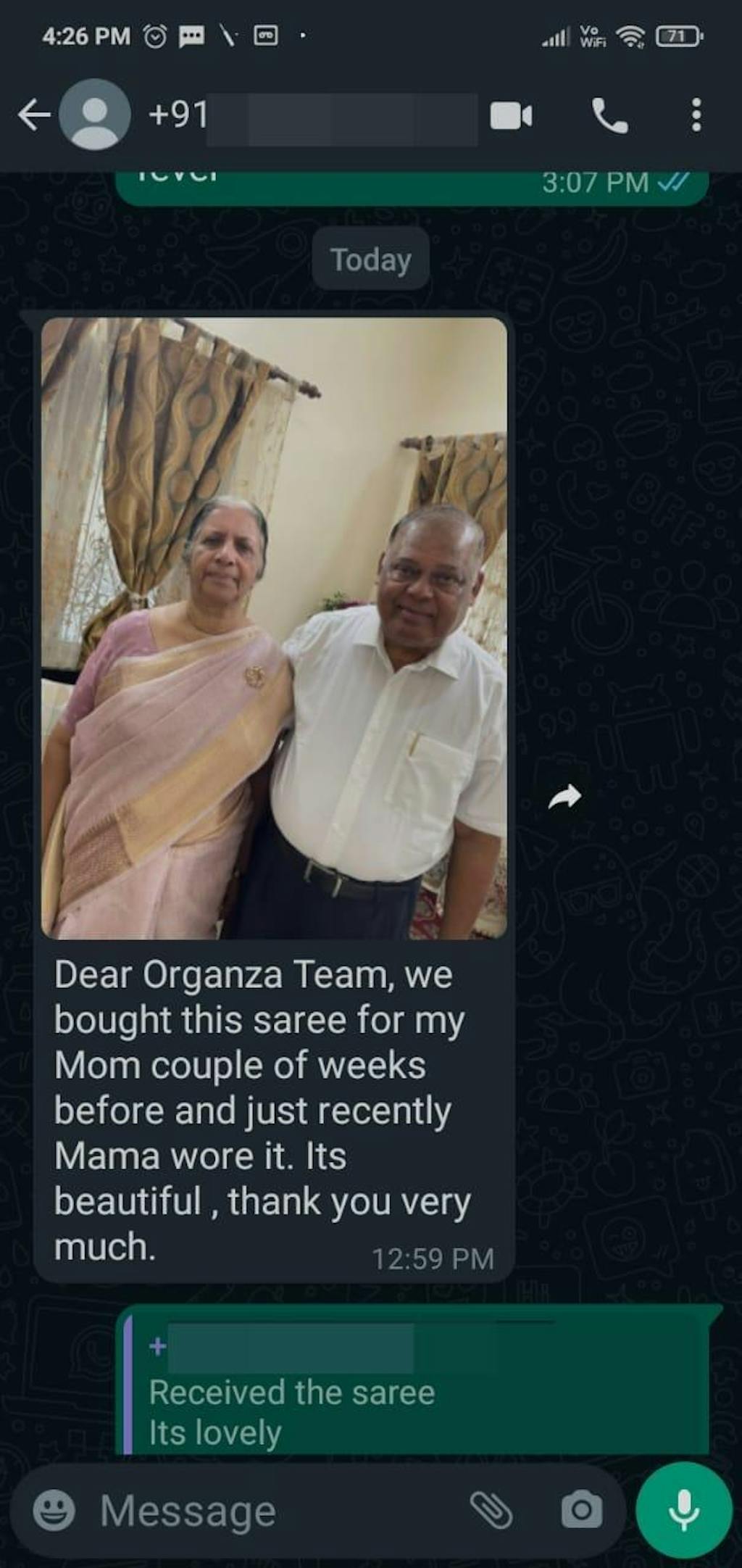 Dear Organza Team, we bought this saree for my Mom couple of weekes before and just recently Mama wore it. Its beautiful, thank you very much.