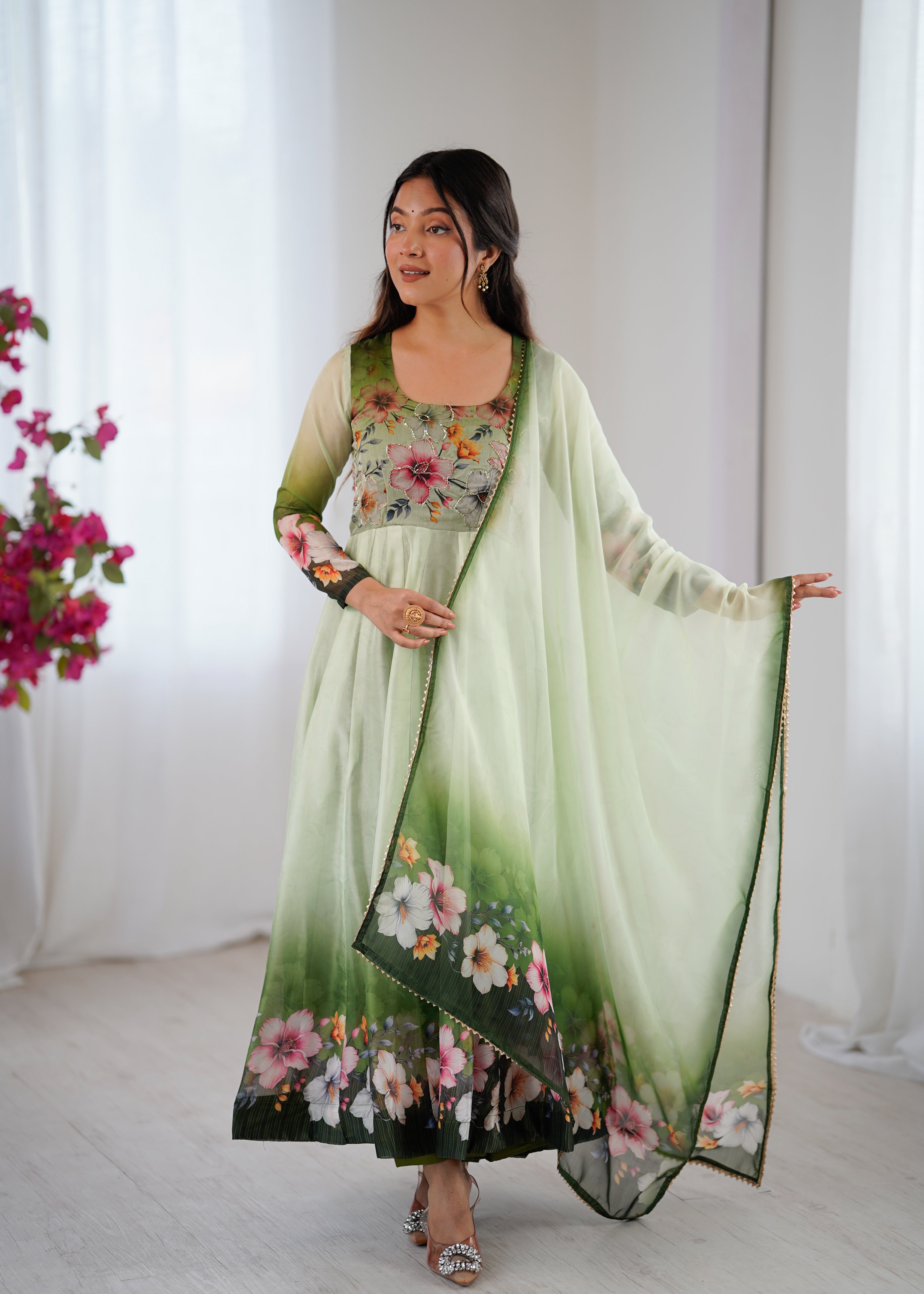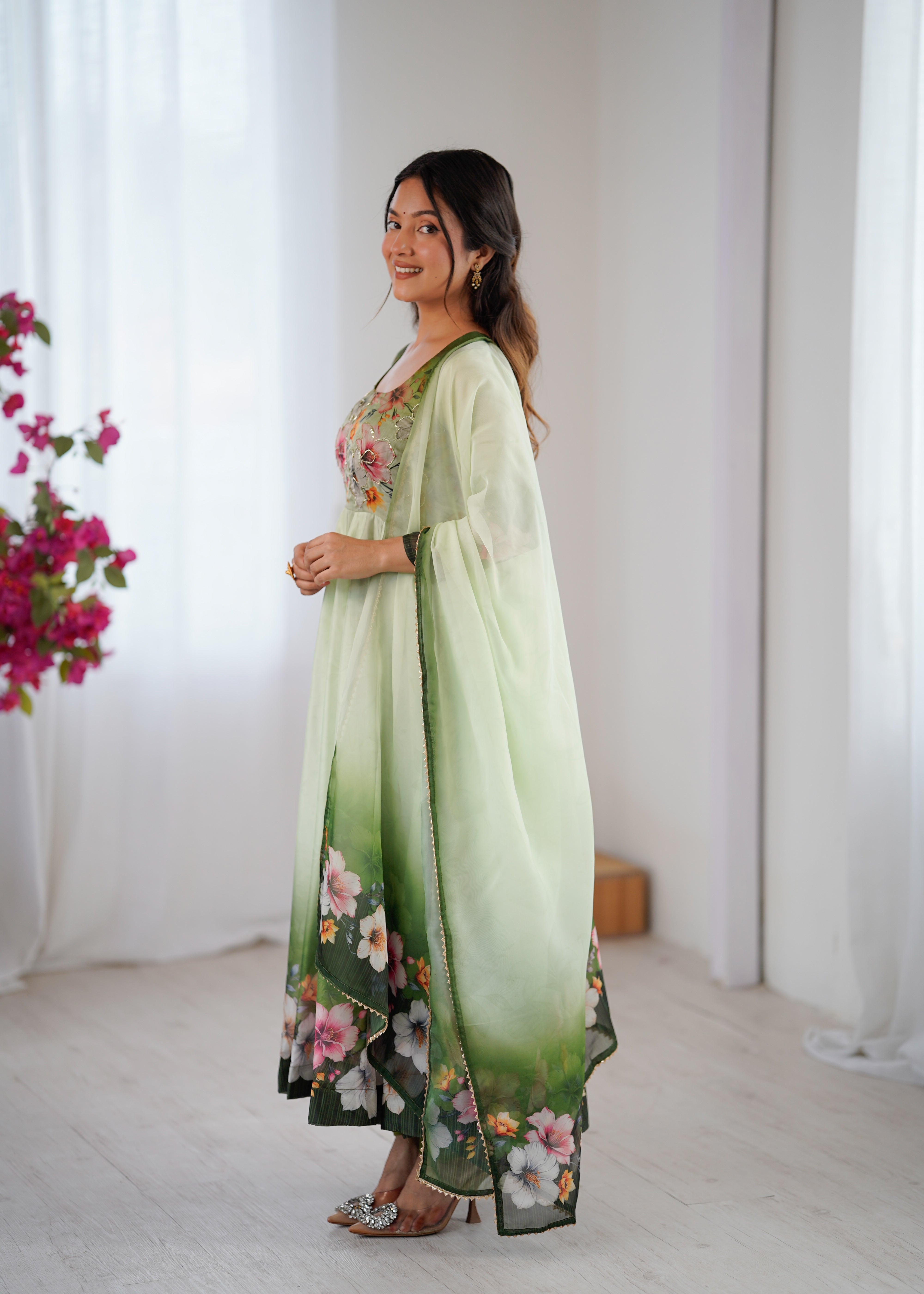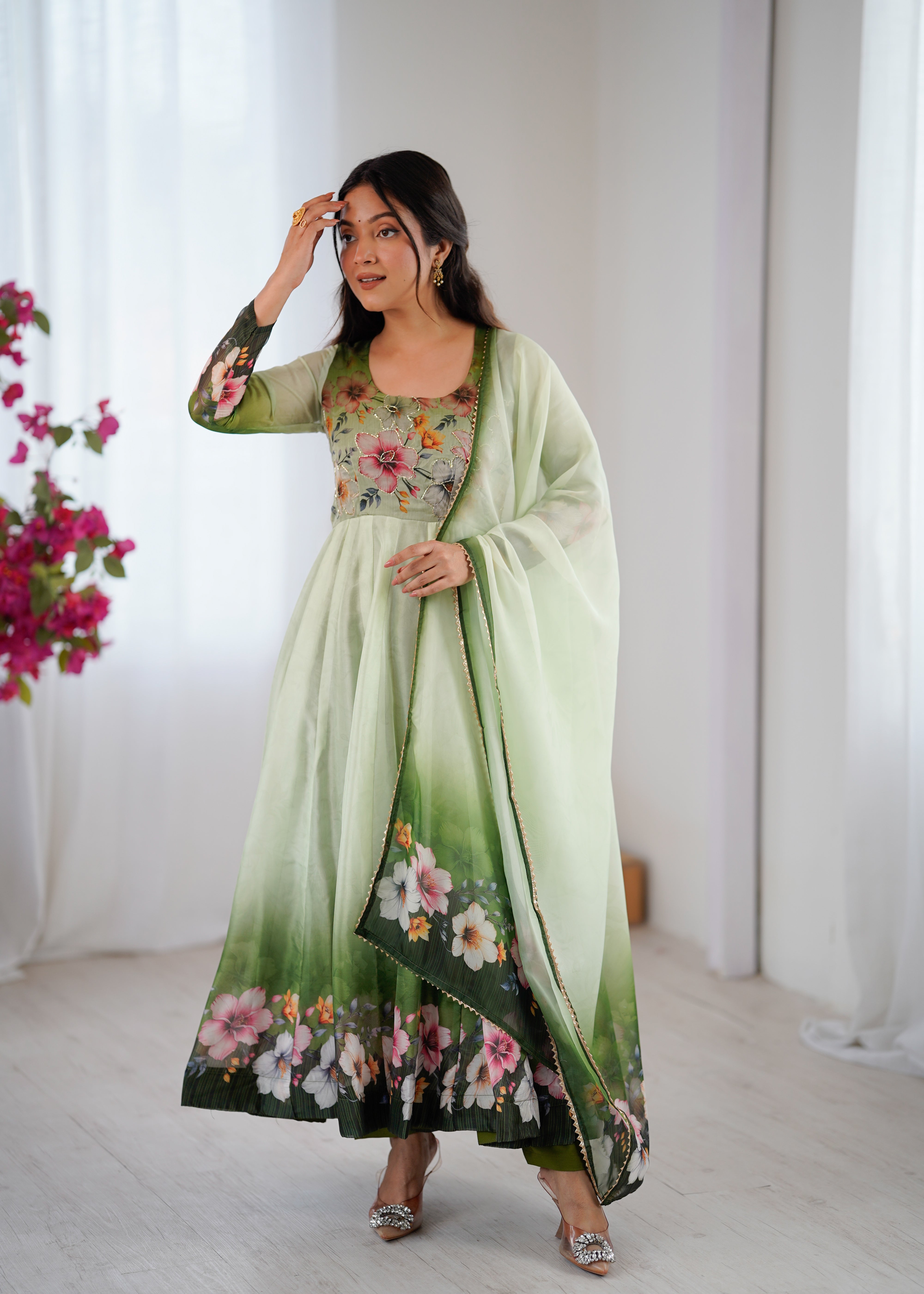 Step into elegant mint green soft Taby Organza Anarkali, adorned with delicate floral digital prints and intricate handwork. Lightweight, flowy, and effortlessly graceful — a perfect blend of charm and comfort! |